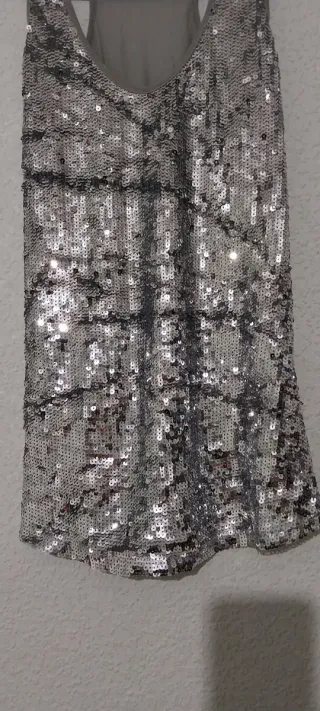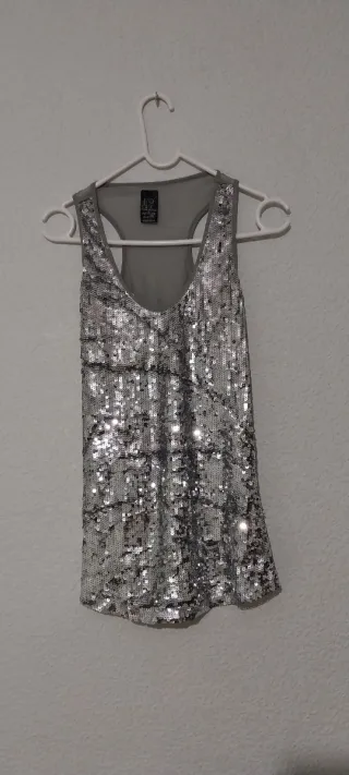 Camiseta de tirantes de Zara con un diseño llamativo. Ideal para estas fiestas. - Talla m. - Cubierta de lentejuelas plateadas. - Tirantes tipo nadador.