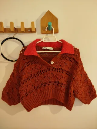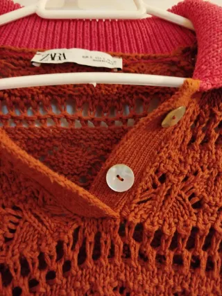 Precioso top corto de manga corta de la marca Zara con un diseño de crochet calado. Color terracota, con cuello en color rosa y cierre con botón.