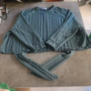 Camiseta de Zara con un diseño cruzado y textura acanalada verde oscuro de la talla M. - Nueva, nunca usada. El papel de la etiqueta de ripio pero conserva el hilo con el seguro. - Manga larga. - Corte cropped. - Tejido suave, comodo y elástico. - Con flechos para cruzar or detrás o por delante.