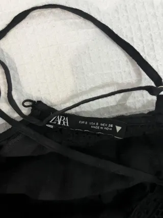 Este top negro de Zara es una prenda delicada y con estilo. - Diseño con tirantes finos. - Detalle de encaje en el escote. - Volante en el bajo. Con etiqueta, sin estrenar