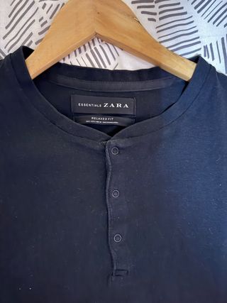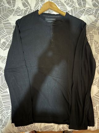 Camiseta de manga larga de Zara en color negro. Presenta un diseño de cuello Henley con botones. - Cuello Henley con botones. - Corte relajado.