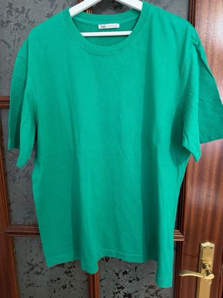 Camiseta básica de Zara en color verde. - Cuello redondo. - Manga corta. - Corte holgado.