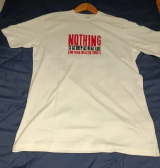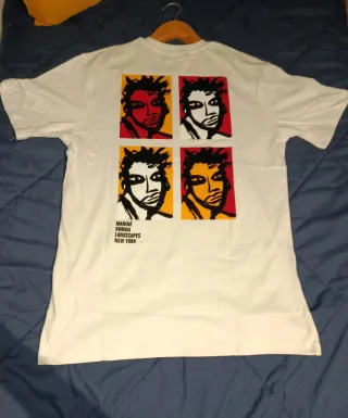 Camiseta blanca con un diseño gráfico llamativo en la espalda. - Estampado de cuatro retratos artísticos. - Texto MARINE HUMAN LANDSCAPES NEW YORK debajo del estampado. Precio negociable