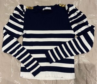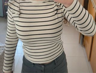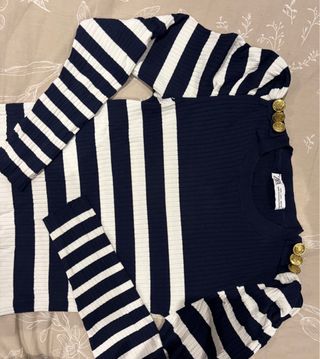 Camiseta de Zara con un diseño de rayas marineras y mangas abullonadas. - Tejido elástico acanalado. - Detalle de botones dorados en el hombro. - Cuello redondo.