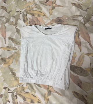 Camiseta básica de Zara en color blanco. Presenta un diseño moderno con hombros marcados y elástico en la cintura. - Hombros marcados, lleva hombreras. - Cintura elástica. - Tejido suave y cómodo.