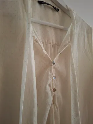 Elegante blusa de colección Zara Trafaluc en color crema, con un diseño delicado y transparente. Preciosos botones de nácar. Color crema con lunares. Perfecto estado. La etiqueta indica talla L, pero es más adecuada para tallas S-M. Hombros: 38 cm. Pecho: 50 cm. Largo: 67 cm. - Tejido ligero con pequeños topos. - Cuello con lazada y botones. - Mangas largas abullonadas.