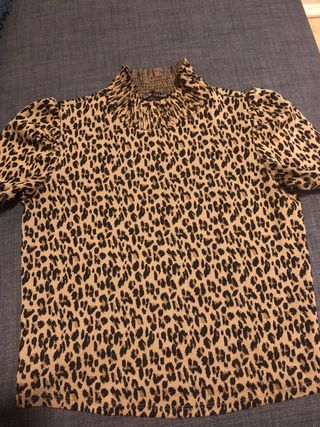 Blusa de manga larga con estampado de leopardo. - Cuello alto fruncido. - Hombros abullonados.