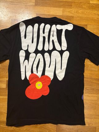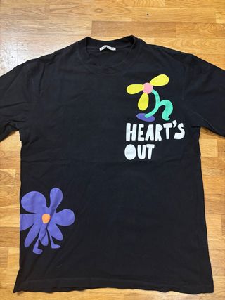 Camiseta sin apenas uso en perfwcto estado negra con dibujos. Camiseta negra de Zara con un diseño original. - Estampado frontal con flores y texto HEART'S OUT. - Diseño de flor morada en la parte inferior izquierda.