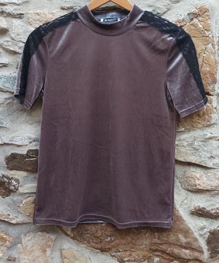 Camiseta 36 Zara, terciopelo gris con cuello perkins y encaje en hombros y manga.