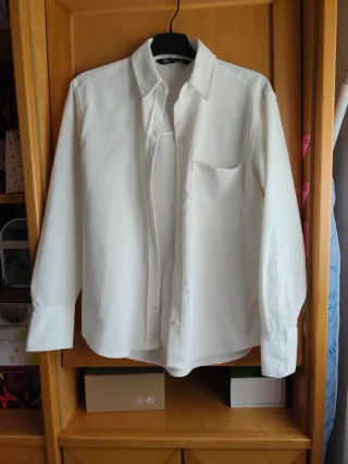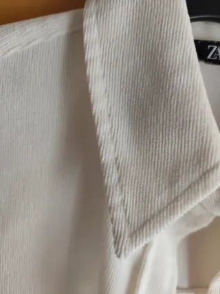 Camisa blanca de Zara TRF Collection, talla S. Diseño muy favorecedor con escote en pico, botones frontales efecto madera y cintura ajustable con cordón, que permite adaptarla y marcar la silueta. Mangas largas con detalle de abertura y botón en los puños, aportando un toque especial y elegante. Tejido tipo pana. Perfecta tanto para looks casuales con vaqueros como para outfits más arreglados.