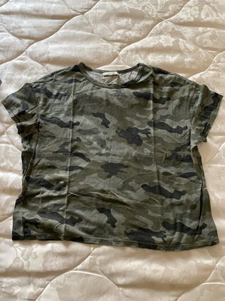 Camiseta de manga corta con estampado de camuflaje. - Diseño de camuflaje en tonos verdes y negros. - Cuello redondo. - Manga corta.