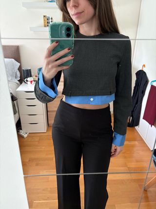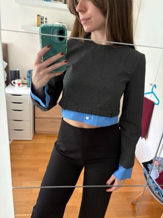 Top de Zara de cuadros gris con efecto camisa debajo en azul. - Manga larga. - Corte cropped. talla XS. estilo miu miu. No se ha usado nunca.