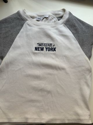 Remera de Zara con diseño de Times Square of New York. - Mangas raglán grises. - Cuerpo principal blanco acanalado. - Bordado frontal. - Cuello redondo.