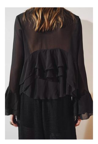 Camisa vaporosa de Zara con un bonito diseño. - Mangas largas con volantes. - Cierre de cordones en el escote. - Detalle de volantes en el bajo.