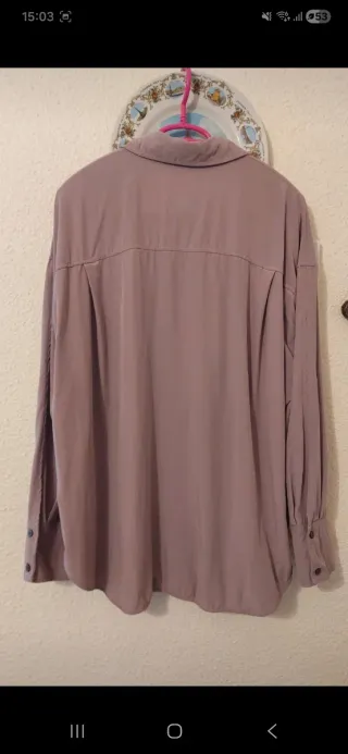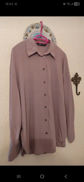 Camisa de Zara de corte oversize en color beige claro. - Cuello camisero. - Manga larga. - Cierre de botones. - Bolsillo en pecho.