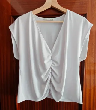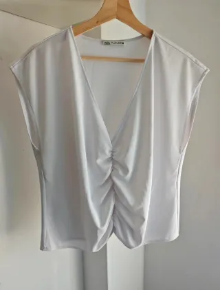 Blusa elegante de ZARA con un diseño drapeado en la parte delantera. - Escote en V pronunciado. - Mangas cortas tipo murciélago. - Tejido suave y fluido.