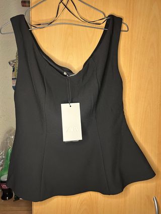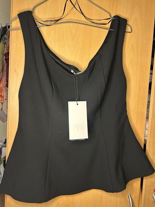 Elegante blusa negra de Zara, perfecta para cualquier ocasión. - Diseño sin mangas. - Escote pronunciado. - Corte peplum.