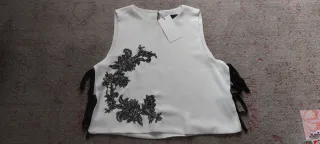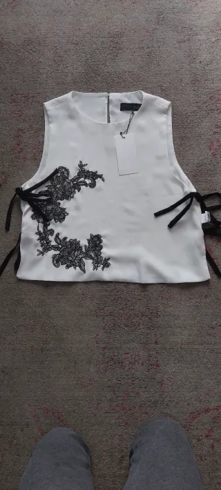 Elegante top de Zara con detalles de encaje negro sobre fondo blanco. Perfecto para ocasiones especiales. - Diseño sin mangas. - Adornos de encaje floral. - Lazos laterales para ajustar.