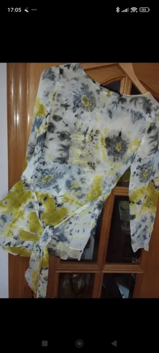 Camisa con un diseño cruzado y un bonito color que combina tonos naranjas y amarillos. No lleva etiqueta pero es de Zara. - Tejido satinado. - Cuello camisero. - Manga larga.