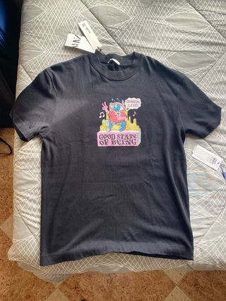 Camiseta negra de Zara con un diseño gráfico llamativo en el pecho. - Estampado frontal con personaje y texto GOOD STATE OF BEING. - Cuello redondo y manga corta. - Tejido suave y cómodo.