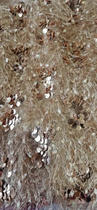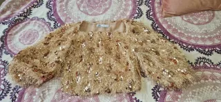 Elegante top de fiesta de Zara, perfecto para ocasiones especiales. Su diseño llamativo lo hace destacar. - Acabado con flecos y lentejuelas. - Cuello cuadrado. - Manga larga.
