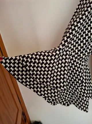 Camisa de manga larga con un llamativo estampado. - Diseño de cuadros en blanco y negro. - Cuello en V. - Mangas acampanadas con doble volante