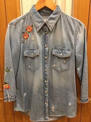 Camisa tejana de Zara Woman con un diseño único. mide de hombros 39 cm mide de sisa 50 cm mide de larga 75 cm mide de mangas 50 cm - Bordados florales en la parte delantera y en una manga. - Bolsillos con solapa en el pecho. - Detalle de rotos y deshilachados. - Cierre de botones metálicos.