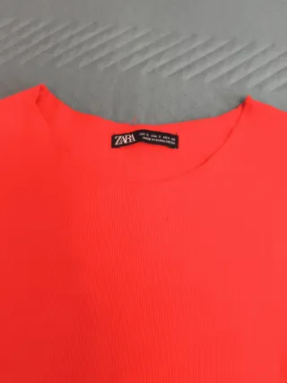 Camiseta de Zara en color coral, con un diseño moderno y versátil. - Corte recto. - Manga corta. - Cuello redondo.