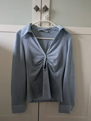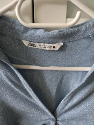 Camiseta de punto calado en color azul, perfecto para añadir un toque especial a tu look. - Diseño con textura. - Cuello redondo. Talla M de Zara.