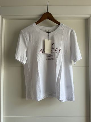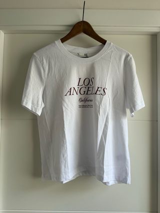 Camiseta blanca con estampado de Los Angeles California en color burdeos. - Diseño con texto Los Angeles California en color burdeos. - Cuello redondo y manga corta. Talla M nueva con etiquetas.