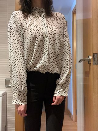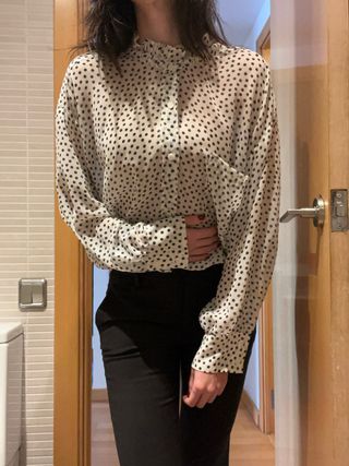 Elegante camisa de Zara con estampado de lunares. - Diseño con cuello alto y volantes. - Cierre de botones. - Manga larga con puños.
