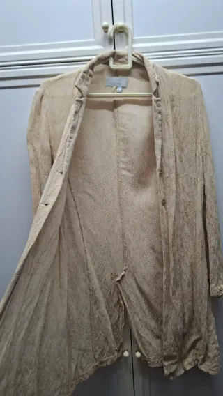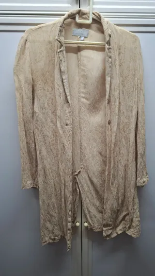 Fantástica blusa / túnica ligera de color beige / marrón muy claro, con escote redondo amplio con un lazo para ajustar. Manga corta abullonada. Plastrón redondeado en el escote con botones. Corte amplio / évasé / trapecio. Tejido muy ligero y vaporoso, es una gasa / un velo. En la espalda, hay un pequeño plastrón redondeado en la nuca. Zara Basic, talla S (36-38). 70% algodón 30% SEDA!! En muy buen estado. Estilo naif, tipo vintage - retro. NO HAGO ENVÍOS POR WALLAPOP