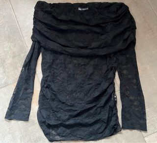 Top de tul negro de Zara con detalles de encaje y lazada frontal. - Diseño fruncido. - Tirantes anchos. - Acabado con puntilla. - Cierre frontal con aberturas enlazadas.