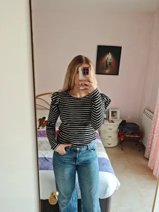 Camiseta de rayas con volantes en los hombros. - Diseño de rayas blancas y negras. - Mangas largas. - Detalle de volantes en los hombros.