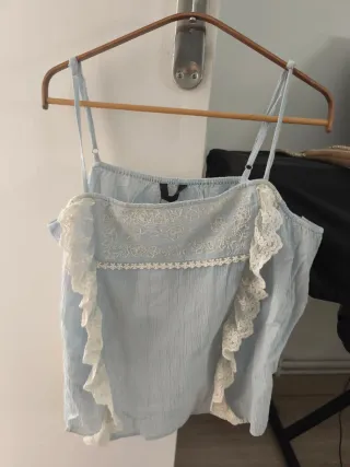 Bonito top de tirantes con detalles de encaje. - Diseño con volantes de encaje en los laterales. - Tirantes finos ajustables.
