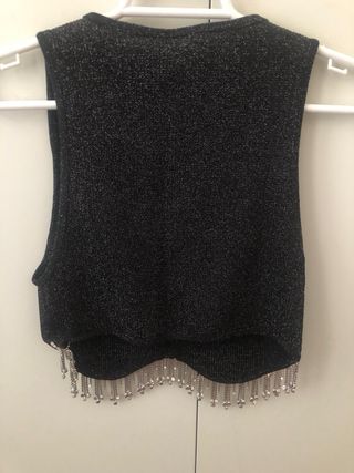 Top corto de Zara con un tejido brillante y detalles de flecos con pedrería en el bajo. - Diseño sin mangas. - Escote redondo. - Bajo con flecos de pedrería.