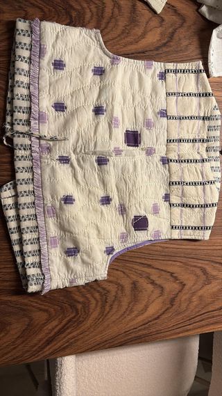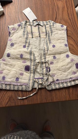 Chaleco corto con diseño acolchado y detalles de flecos. - Cierre con lazada. - Estampado geométrico. - Tejido ligero.