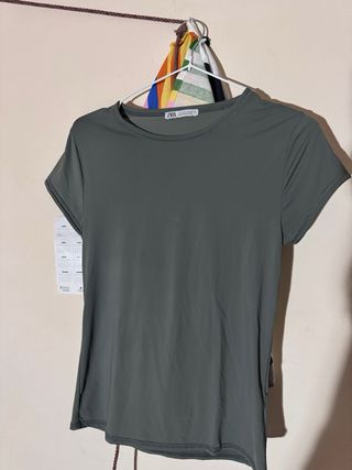 Camiseta básica de manga corta de Zara. Un básico versátil para tu armario. - Cuello redondo. - Tejido suave y ligero.