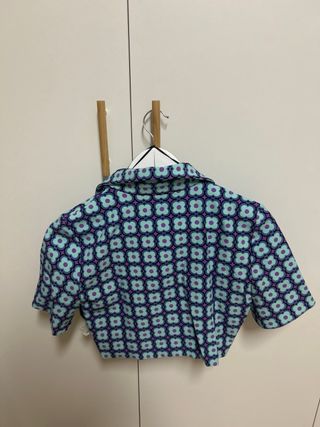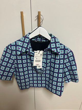 Camisa corta de Zara con un llamativo estampado floral. - Diseño con cuello y manga corta. - Estampado en tonos morados y verde azulado. - Talla XS (34/6).