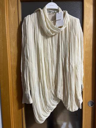 Elegante blusa de Zara con un diseño plisado y drapeado. - Color beige con detalles - Cuello alto con abertura. - Mangas largas abullonadas.