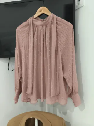 Camisa rosa de Zara, tela fina y ligera. Manga estilo murciélago y caída muy bonita. Talla M. Perfecta para looks arreglados, cómodos y femeninos.