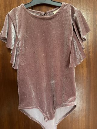 Body de vestir para niña con un bonito diseño. - Tejido de terciopelo suave. - Detalle de pequeños brillos por toda la prenda. - Mangas con volantes. - Cierre de botón en la espalda.