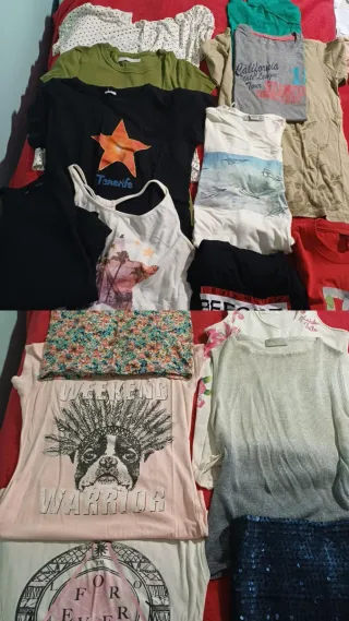 Pack de 17 camisetas variadas talla M en general, bastante ajustables. Hay 1 Falda que es la de flores. Y dos pantalones que no salen en la foto porque no me cabían 😅 También se pueden comprar packs: 8 prendas por 10€ 5 prendas por 7€ 3 prendas por 5€