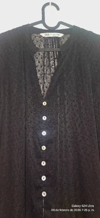 Elegante blusa negra de Zara con diseño texturizado y mangas abullonadas: - Cuello camisero, puños con volantes y cierre de botones. - Aunque la tela no es brillante, tiene cierto reflejo (ver fotos 5 y 6 para apreciar la diferencia con luz tenue y luz natural). - Es un diseño versátil: looks casuales o eventos formales. - Mangas abullonadas con forma de jamón. - El tejido es sintético y práctico para viajar: se seca bastante rápido tras el lavado y el efecto plisado hace que no te preocupes por las arrugas. - Comprueba bien las medidas ya que no hago devolución. - Añado fotos de la web y María Segarra como referencia.