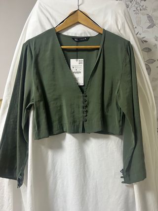 Elegante camisa cruzada de Zara con un diseño moderno y favorecedor. Perfecta para añadir un toque sofisticado a tu armario. #zara #verde #camisa #satinada #ceremonia - Tejido satinado con caída. - Lazada ajustable en la cintura. - Mangas largas con puño.
