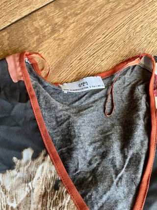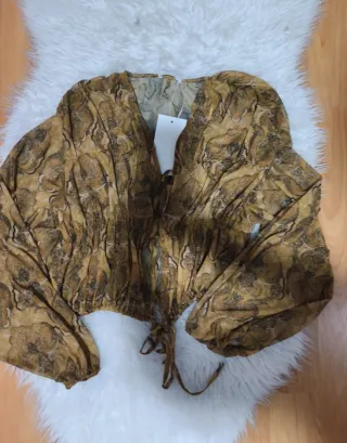 Blusa de Zara con un estampado vibrante y detalles brillantes. Su diseño de manga larga y el tejido ligero la hacen ideal para diversas ocasiones. - Tejido semitransparente con estampado de motivos. - Mangas largas abullonadas. - Detalle de nudo en la parte delantera. - Puños elásticos. - Cremallera lateral y elástico atras, vale para M y L