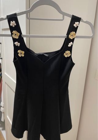 Elegante top con diseño peplum y tirantes adornados con flores y perlas. - Tirantes con apliques florales dorados y perlas. - Corte peplum. - Escote en V.