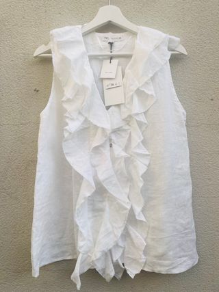 Elegante blusa sin mangas con detalles de volantes. Comprado hace algo más de un mes, los vendo porque se me pasó el plazo de devolución. - Confeccionada en lino. - Cierre de botones en la parte delantera. - Diseño con volantes verticales.