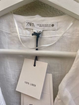 Elegante blusa blanca de Zara, un básico versátil y atemporal que no puede faltar en tu armario. Tiene una caída preciosa y es muy cómoda. Talla: M (38-40). Color blanco roto/crudo con tejido fluido de tacto suave y bolsillos delanteros. Espalda: Elegante canesú con detalle de pliegue central que aporta movimiento y amplitud. Corte bajo redondeado tipo túnica, más largo por detrás para un estilo muy favorecedor. Muy versátil de manga larga con puños sencillos. Perfecta para llevar por fuera con vaqueros o por dentro de una falda de vestir.