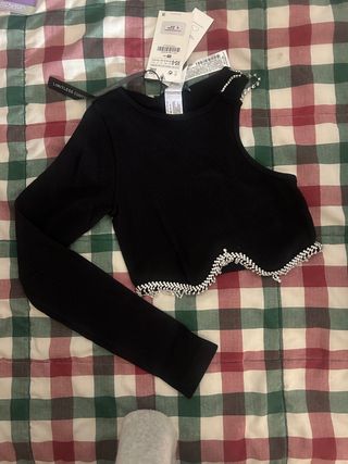 Top asimétrico de Zara con detalles brillantes. - una manga marga. - Acabado acanalado. - Borde con pedrería y brillos Talla XS-S que se adapta muy bien Nuevo sin estrenar Perfecto para festivales y eventos #asimetrico #zara #topcrop #croptop